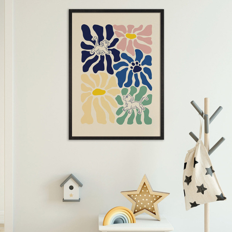 Poster floral Le Roi Lion bleu 30 x 40 cm, parfait pour une chambre d’enfant ou un mur à thème Disney. Ce format compact présente un visuel stylisé de Simba entouré de motifs floraux, sur fond bleu. Son design graphique s’intègre facilement dans une déco moderne, jungle ou bohème. À encadrer ou à accrocher tel quel pour une touche originale et tendance dans l’univers du Roi Lion.