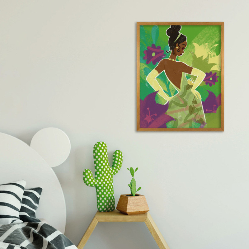Ce grand poster de Tiana, héroïne de La Princesse et la Grenouille, apporte une vraie touche de fraîcheur à ton intérieur. Avec ses teintes vertes douces et son style élégant, il s’intègre parfaitement dans une chambre d’enfant ou un coin déco inspiré des classiques Disney.