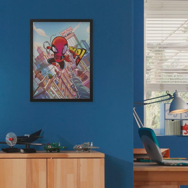 Ce poster Spider-Man 40 x 50 cm s’intègre facilement dans une chambre d’enfant, un bureau ou un coin dédié aux fans de Marvel. Le visuel met en scène un mini Spider-Man dans un décor urbain, avec des couleurs rouges marquées qui donnent du caractère à la pièce. Imprimé sur un support intissé, ce format moyen est adapté pour être accroché seul ou en composition avec d’autres affiches de super-héros ! Une bonne idée déco pour pour personnaliser votre espace !