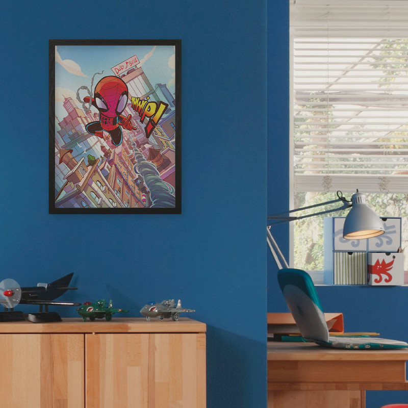Avec son format 50 x 70 cm, ce poster mini Spider-Man attire immédiatement le regard et trouve facilement sa place dans une chambre d’enfant, un bureau ado ou une pièce à l’ambiance geek. Le design met en avant un Spider-Man version cartoon dans une scène de ville, avec des tons rouges qui donnent de l’énergie à la composition. L’impression sur papier intissé assure un bon rendu des couleurs et une tenue fiable dans le temps. Pour compléter une décoration murale super-héros sans surcharge visuelle. Parfait pour personnaliser votre espace !