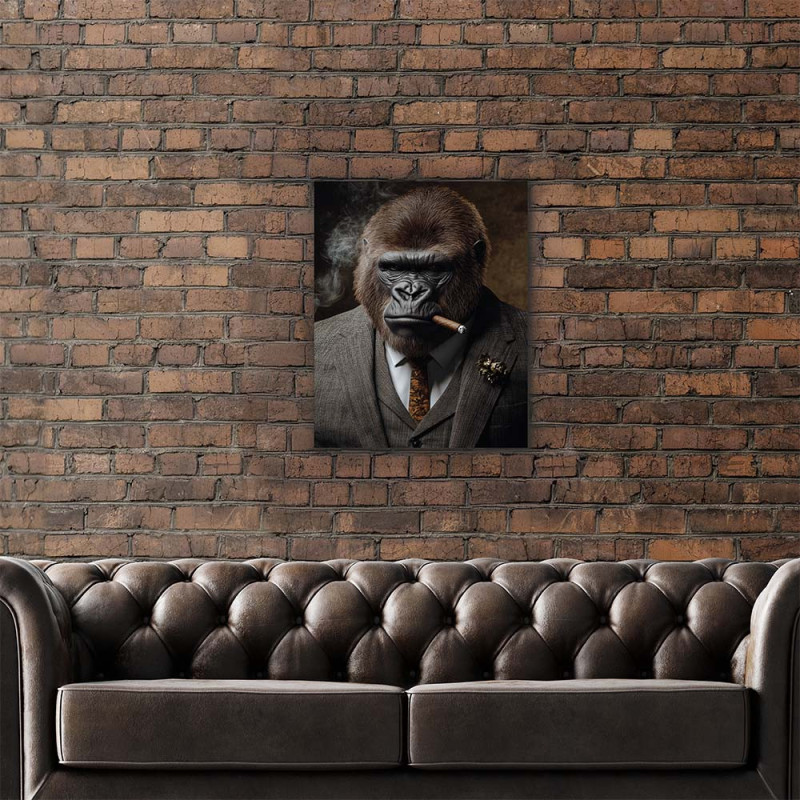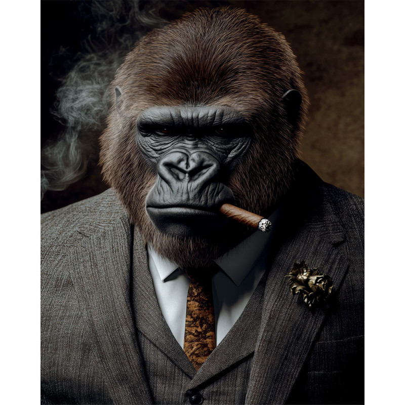 Le cigare, accessoire emblématique du pouvoir et de la réussite, complète magistralement cette composition. Il ajoute une touche de nonchalance calculée, comme si ce gorille businessman avait déjà tout conquis et pouvait désormais savourer son succès. Cette œuvre murale animale sophistiquée 40x50 cm fonctionne particulièrement bien dans les intérieurs masculins modernes, aux côtés de mobilier en cuir, de bibliothèques imposantes ou d'une décoration industrielle épurée.