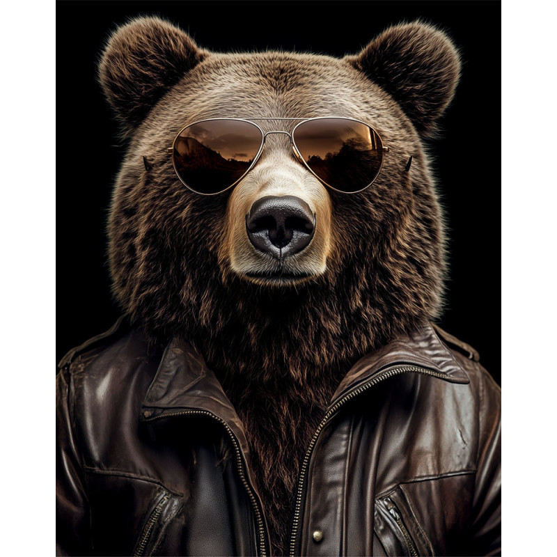 Adoptez l'attitude avec ce tableau ours en blouson cuir qui respire la coolitude et l'indépendance. Cet ours imposant arborant lunettes aviateur et perfecto de motard incarne parfaitement l'esprit rock'n'roll : puissant, libre et résolument anticonformiste. Le réalisme photographique du pelage contraste magnifiquement avec l'accessoirisation humaine, créant une image à la fois surprenante et captivante.