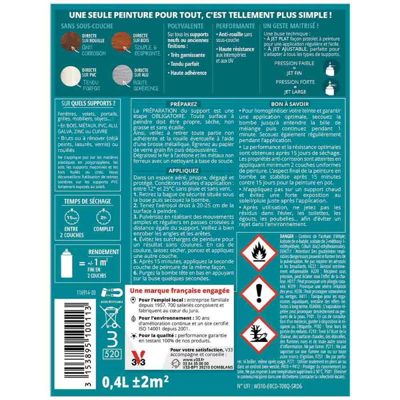 La bombe de peinture aérosol Multi-Matériaux V33 Gris Aluminium 400ml est la solution idéale pour vos projets de rénovation et décoration. Grâce à sa formule performante et polyvalente, cette peinture s’applique facilement sur tous types de supports et matériaux, qu’il s’agisse de bois, métaux, PVC, alu, galva, zinc ou cuivre. Son format aérosol pratique garantit une application fluide et contrôlée, même sur des surfaces difficiles à atteindre. Que vos supports soient bruts, à rénover, déjà peints, lasurés, vernis ou rouillés, cette peinture s’adapte parfaitement sans nécessiter de sous-couche. Elle est souple et respirante pour le bois, offre une protection anti-corrosion pour les supports métalliques, et garantit une haute adhérence sur le PVC et l'aluminium, assurant ainsi une finishing durable et de qualité. Elle apportera une touche moderne et raffinée à vos mobiliers, objets, fenêtres, portails, grilles et bien plus encore. Résistante aux intempéries, cette peinture aérosol est idéale pour les projets extérieurs et vous permet d’obtenir des résultats professionnels !