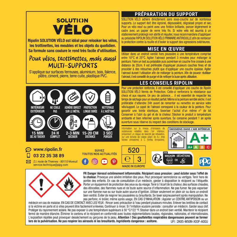 Dynamisez vos objets avec la bombe de peinture Ripolin Jaune Vif, au fini éclatant. Idéale pour customiser vélos, trottinettes ou éléments de décoration, cette peinture s’adapte à de nombreux matériaux : métaux, aluminium, bois, plastique PVC, faïence, plâtre, pierre, terre cuite ou encore ciment.