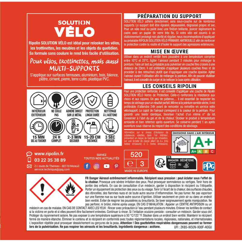 Donnez une touche dynamique et énergique à vos projets avec la bombe de peinture Ripolin Rouge Turbo , spécialement conçue pour la rénovation et le relooking de vélos, trottinettes et autres surfaces. Sa formule multi-supports permet une application directe sur une variété de matériaux tels que le métal, l'aluminium, le bois, le plastique PVC, la faïence, le plâtre, le ciment, la pierre et la terre cuite, sans nécessiter de sous-couche.