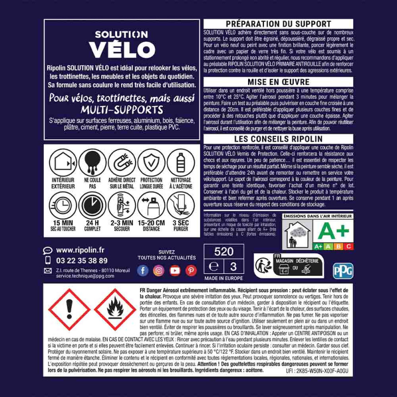 Redonnez vie à vos objets avec la bombe de peinture Ripolin Solution Vélo Bleu Galaxie, au fini élégant et au haut pouvoir couvrant. Spécialement conçue pour la rénovation des vélos, trottinettes et autres équipements, cette peinture multi-supports s’applique facilement sur le métal, l’aluminium, le bois, la faïence, le plâtre, le ciment, la pierre, la terre cuite et même le plastique PVC, sans besoin de sous-couche.