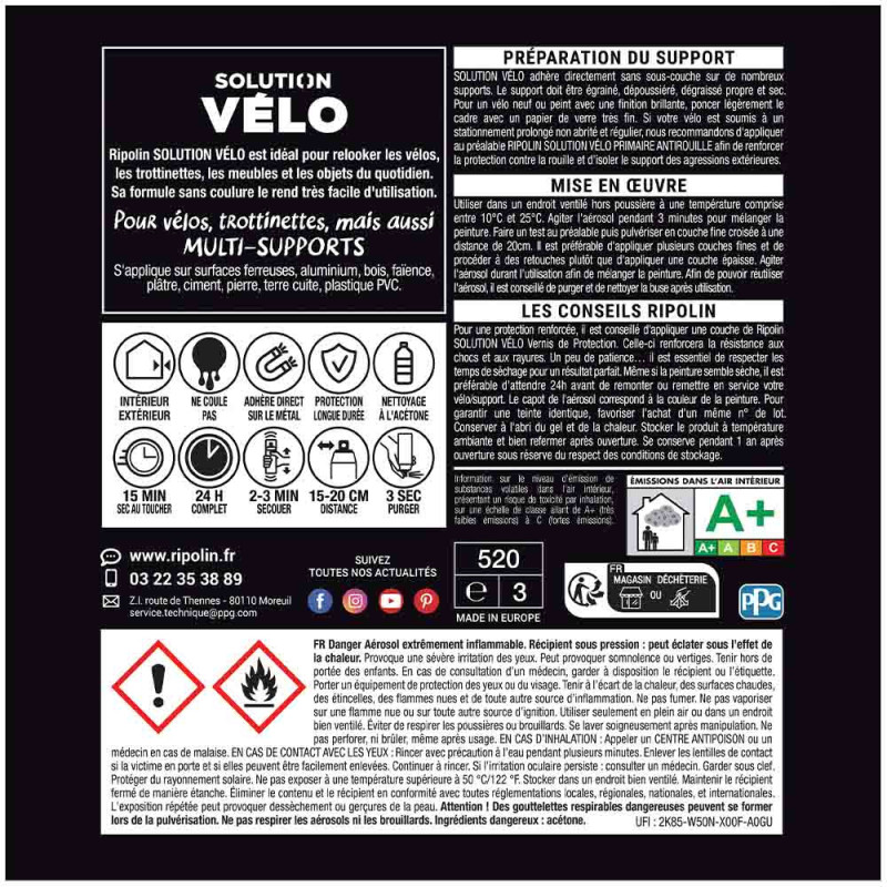 La peinture Ripolin Piste Noir est idéale pour le relooking et la rénovation de vos vélos, trottinettes et autres équipements. Grâce à sa formule multi-supports, cette peinture s'applique facilement sur une variété de matériaux tels que métal, aluminium, bois, plastique PVC, faïence, plâtre, ciment, pierre et terre cuite, sans nécessiter de sous-couche.