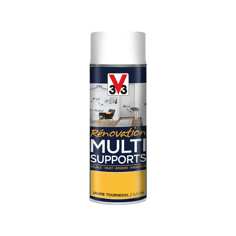 La peinture V33 Rénovation multi-supports en aérosol est idéale pour rénover tous les supports à l'intérieur de la maison : mobilier, radiateurs, objets, surfaces moulurées ou difficiles d'accès (radiateurs, chaises à barreaux) en : bois (brut, verni ou déjà peint et dérivé), métaux (fer,fonte et métaux non ferreux), PVC, verre. Polyvalente, elle convient parfaitement à tout type de support, (applicable sur plus de 20 supports différents). Grâce à sa buse spéciale l'aérosol multi-supports vous permet une application rapide, facile et régulière pour un résultat esthétique parfait. Cette peinture présente une haute résistance à l'eau, aux tâches, aux rayures, aux chocs...Facile d'entretien et d'application. Séchage entre deux couches : 15 min. Séchage complet en 2 heures.