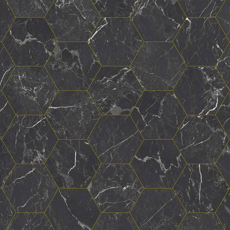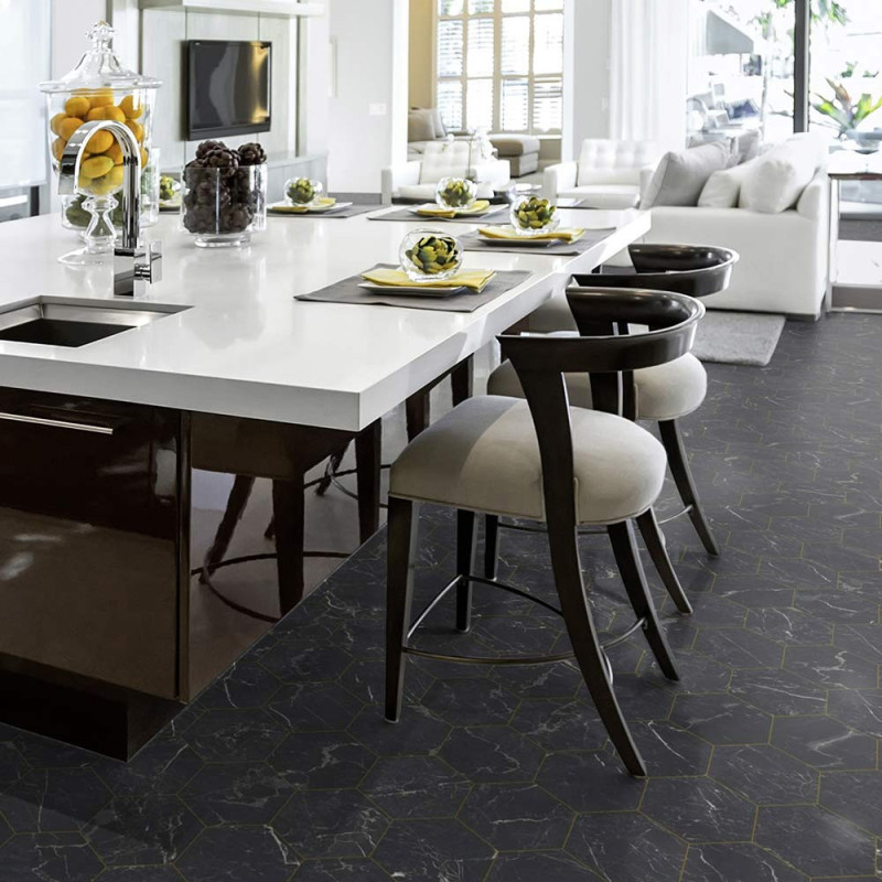 Sol PVC en rouleau décor carreau hexagone marbre noir largeur 2m ep.2,6mm passage intensif habitat