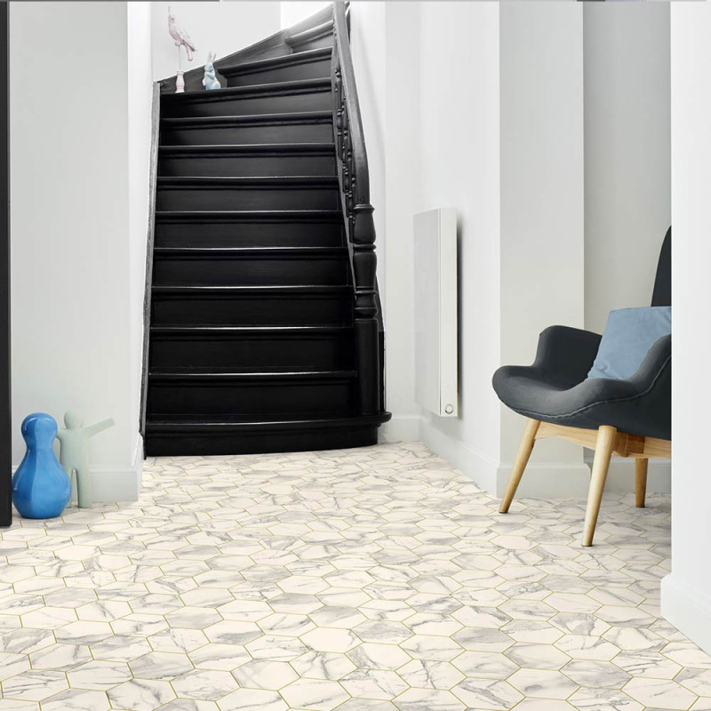 Ce revêtement de sol pvc décor carreau exagone marbre blanc dispose d'une bonne résistance à l'usure quotidienne, ainsi qu'une réduction sonore de 20dB, cette gamme est une solution de revêtement de sol idéale pour toutes les pièces de votre maison, y compris les chambres, les salons, les cuisines et même les salles de bains. Son envers mousse procure une sensation chaleureuse lorsque l'on marche pieds nus. Grâce à notre traitement de surface Extreme Protection, votre sol est facile à nettoyer et à entretenir.