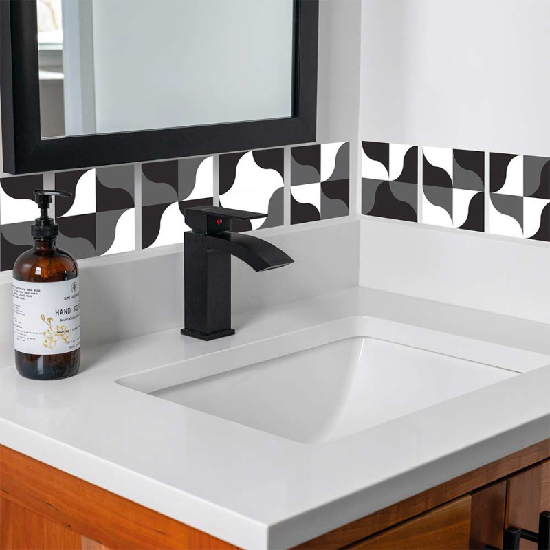Pack de 9 stickers pour carrelage motif art déco seventies blanc, gris et noir 10 cm x 10 cm