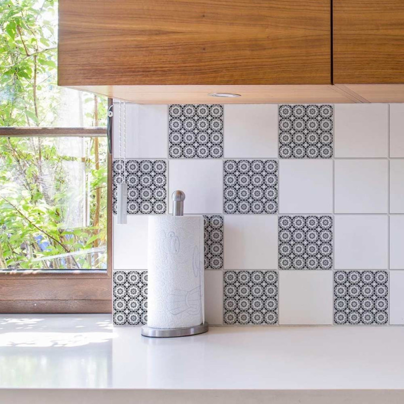 Pack de 9 stickers pour carrelage imitation carreaux ciment algue de couleurs blanc et gris. Cela permet de recouvrir votre ancien carrelage tout en apportant une touche de décoration à votre pièce. Facile d'entretien. Nettoyage avec une éponge humide à l’eau savonneuse.