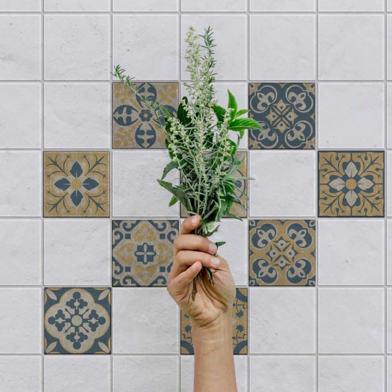 Pack de 9 stickers pour carrelage imitation carreaux ciment de couleurs jaune et bleu. Cela permet de recouvrir votre ancien carrelage tout en apportant une touche de décoration à votre pièce. Facile d'entretien. Nettoyage avec une éponge humide à l’eau savonneuse.