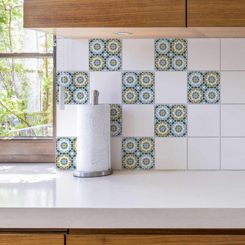 Pack de 6 stickers pour carrelage imitation carreaux ciment jaune et bleu. Cela permet de recouvrir votre ancien carrelage tout en apportant une touche de décoration à votre pièce. Facile d'entretien. Nettoyage avec une éponge humide à l’eau savonneuse.
