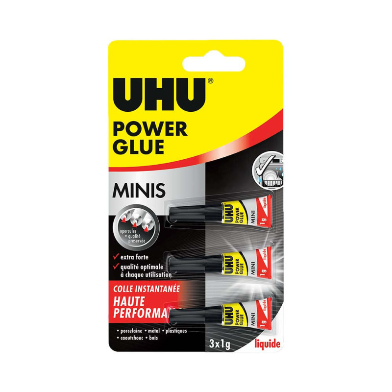 UHU Power glue Minis est un lot de super glue instantanée ultra forte, qui colle/répare tous les matériaux en un temps record ! Sa formule liquide pénètre dans les angles et les joints les plus étroits! Idéale pour coller de petites zones. Une colle à haute performance pour un rendu professionnel ! La colle pénètre dans les angles et les joints