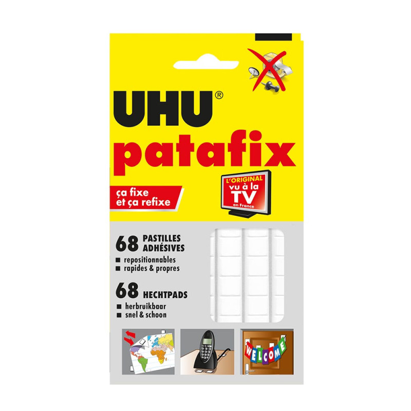 Découvrez UHU Patafix, la solution ingénieuse pour remplacer les clous, le ruban adhésif et les punaises! UHU Patafix est un adhésif détachable et réutilisable parfait pour fixer rapidement et proprement de petits objets tels que des photos, des cartes postales, des dessins et des affiches, les meubles... Adapté à des milliers d'applications à la maison, à l'école et au bureau, il offre une polyvalence inégalée ! Testé sous contrôle dermatologique, UHU Patafix a obtenu le résultat «TRÈS BIEN» lors de tests effectués par l'institut indépendant Dermatest®.