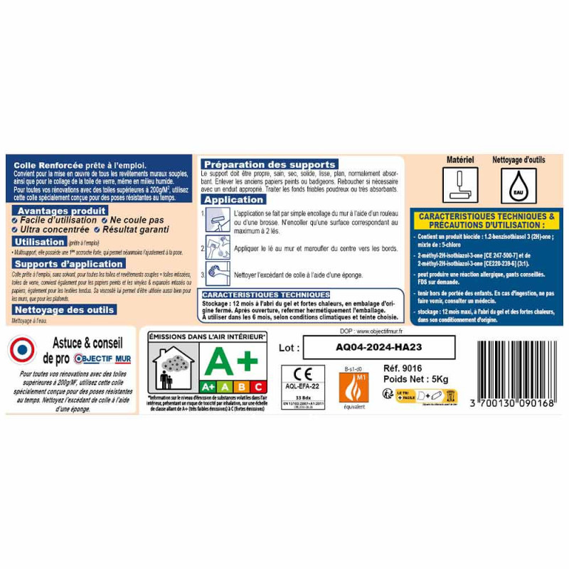 Colle universelle renforcée pour toiles 5 kg, spécialement développée pour les revêtements de plus de 180 g/m². Elle est conçue pour coller efficacement les toiles thermiques KLIMATEC et les toiles lisses épaisses de rénovation intissées. Adaptée aux papiers peints, aux intissés ainsi qu'aux toiles de verre, cette colle est idéale pour tous types de chantiers nécessitant un collage complexe. Elle garantit une résistance maximale et une adhérence optimale grâce à sa haute concentration.