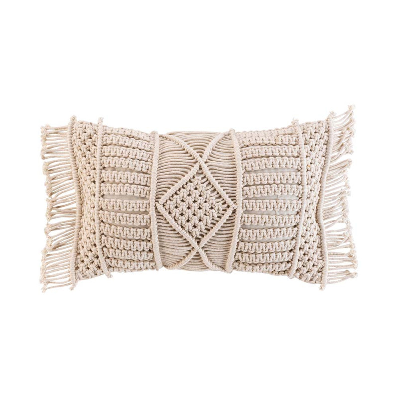 Coussin déhoussable en coton macramé et franges beige naturel 30x50 cm