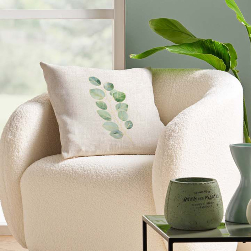 Coussin déhoussable imprimé eucalyptus et métallisé beige 45x45 cm. Un accessoire déco qui apporte élégance à votre intérieur. Son motif délicat et ses touches métallisées subliment un canapé, un lit ou un fauteuil...