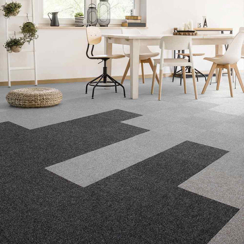 Dalle de moquette aiguilletée côtelée couleur gris nuancé et de dimension 50 x 50 cm. Elle ne nécessite pas de colle et a une très bonne isolation phonique. Elle vous permet de refaire votre pièce un peu de temps.