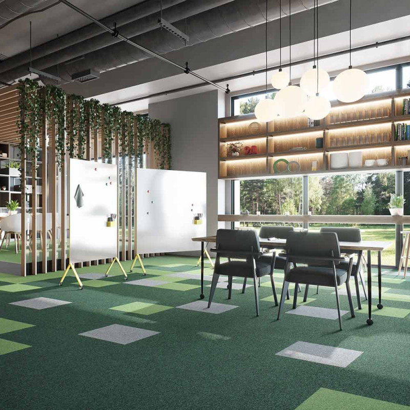 Dalle de moquette bouclée couleur bleu canard et noir et de dimension 50 x 50 cm. Cette moquette très douce a été conçue pour résister à un grand passage. Elle sera idéale pour un usage professionnel, ou des pièces de grand passage. Sa particularité est quelle est autoportante : elle se pose très rapidement et très facilement. Elle ne nécessite pas de colle et a une très bonne isolation phonique. Elle vous permet de refaire votre pièce un peu de temps. Très épaisse, elle apportera un trés bon confort à la marche. Elle se décline en 27 couleurs, incluant des couleurs neutres chic, des nuances calmes inspirées de la nature, ainsi que quelques teintes funky et audacieuses. Elle existe aussi en dimension 100 x 100 cm