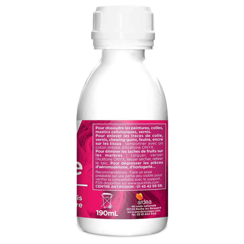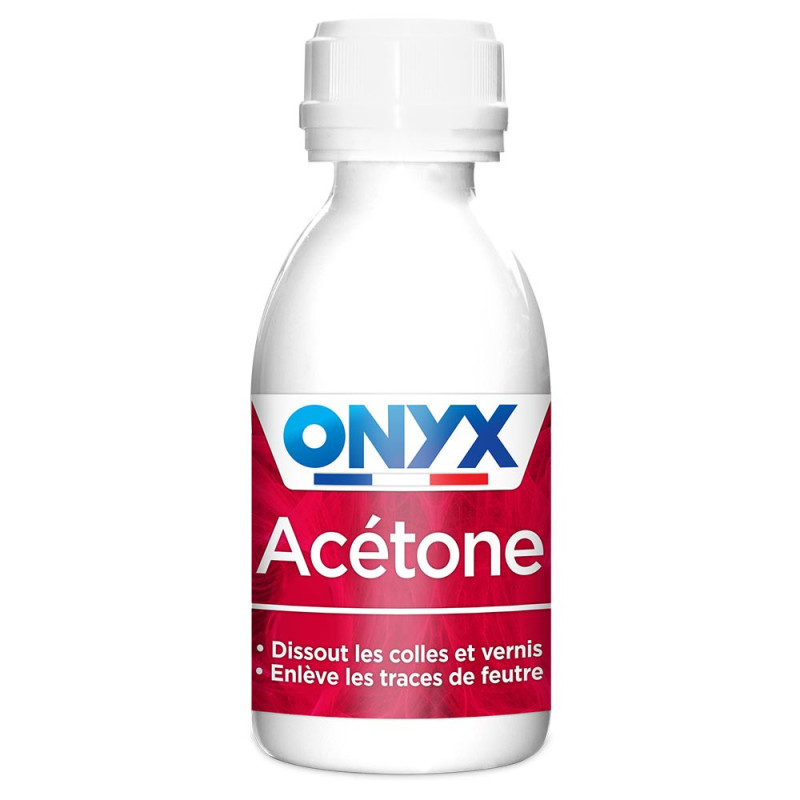 Cet acétone Onyx en 190 mL dissout les colles, peintures, mastics cellulosiques et vernis.