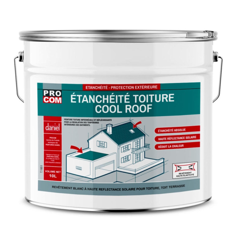 La peinture étanchéité pour toiture PROCOM COLL ROOF blanc 10L est une peinture cool roof anti-chaleur spécialement conçue pour réduire la température intérieure des bâtiments. Grâce à ses propriétés réflectives, cette peinture diminue la température de surface des toitures jusqu'à 20°C et permet un gain de 7 à 10°C en intérieur. Adaptée aux toitures en béton, métal, et bitume, elle nécessite l'application d'un primaire sur les membranes EPDM. En abaissant la température, ce revêtement contribue à des économies d'énergie significatives et réduit les émissions polluantes liées à la climatisation.