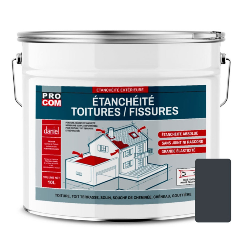 Optez pour la peinture spécial étanchéité toiture et fissure PROCOM gris ardoise 10L est une résine d’étanchéité élastique qui forme un film souple et semi-épais, sans joint ni raccord, assurant une étanchéité parfaite et une protection contre les intempéries et les micro-organismes. Le coloris gris ardoise, à la fois moderne et sobre, apporte une touche élégante et durable à votre habitat ! Cette peinture adhère sur tous les supports comme : le béton, les tuiles, l'ardoise, la tôle, le bois et le bitume. Idéale pour tous les projets d'étanchéité de toiture, elle est parfaite pour les toitures terrasses, la réparation des matériaux fissurés, et l'étanchéité des chéneaux, gouttières, souches de cheminée et acrotères.