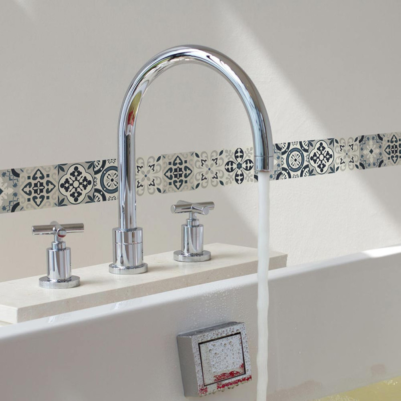 Frise murale adhésive imitation carreaux ciment Borgatella bleu apportera une touche de déco à votre intérieur et de structurer vos pans de murs.