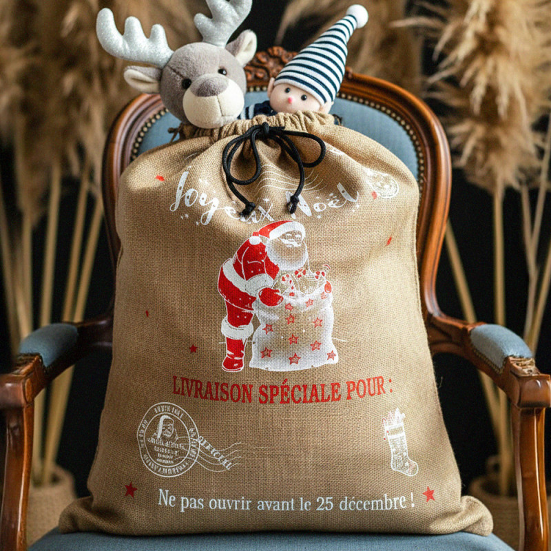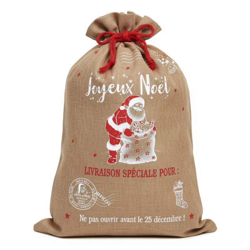 Toile effet jute imprimé sac cadeaux père Noël rouge 150 cm