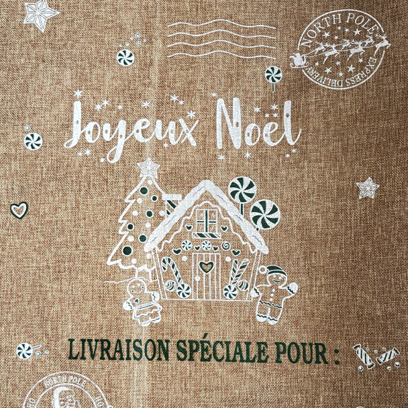 Toile effet jute imprimé sac cadeaux Chalet de Noël vert 150 cm