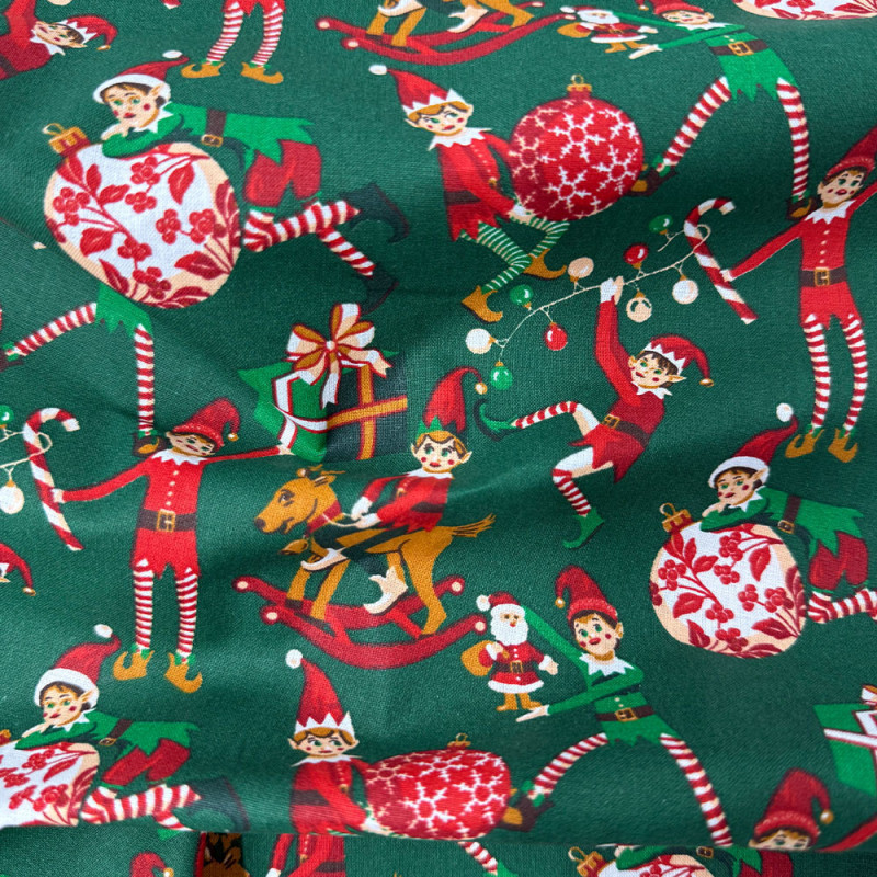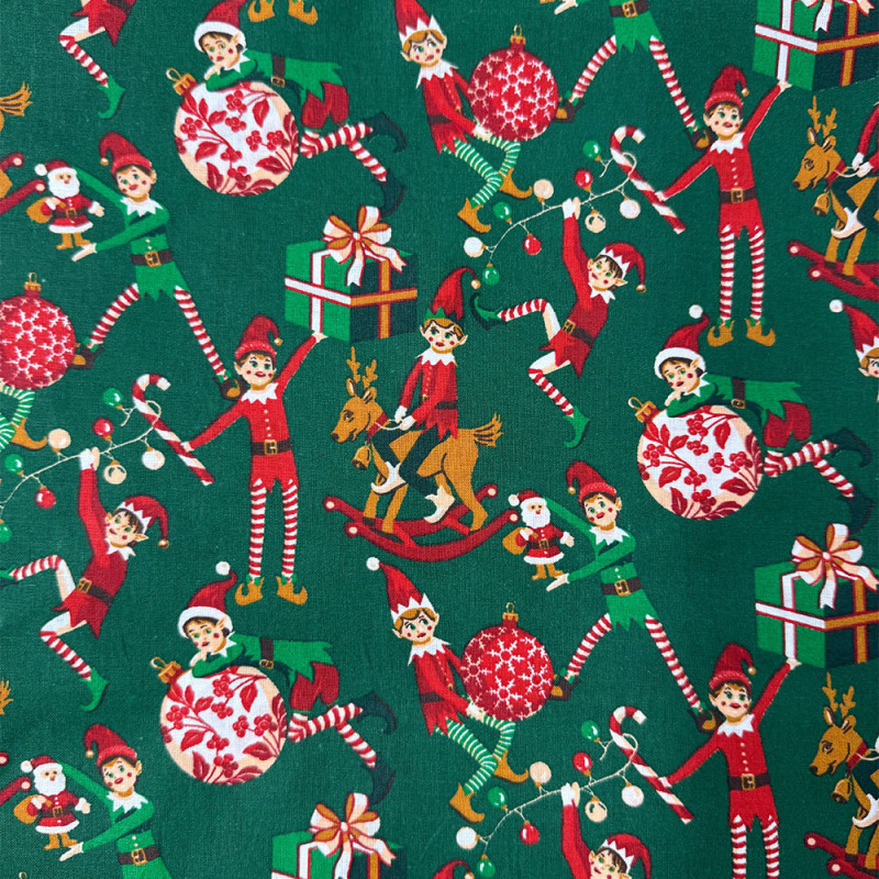 Tissu 100% coton imprimé lutin de Noël vert 150 cm