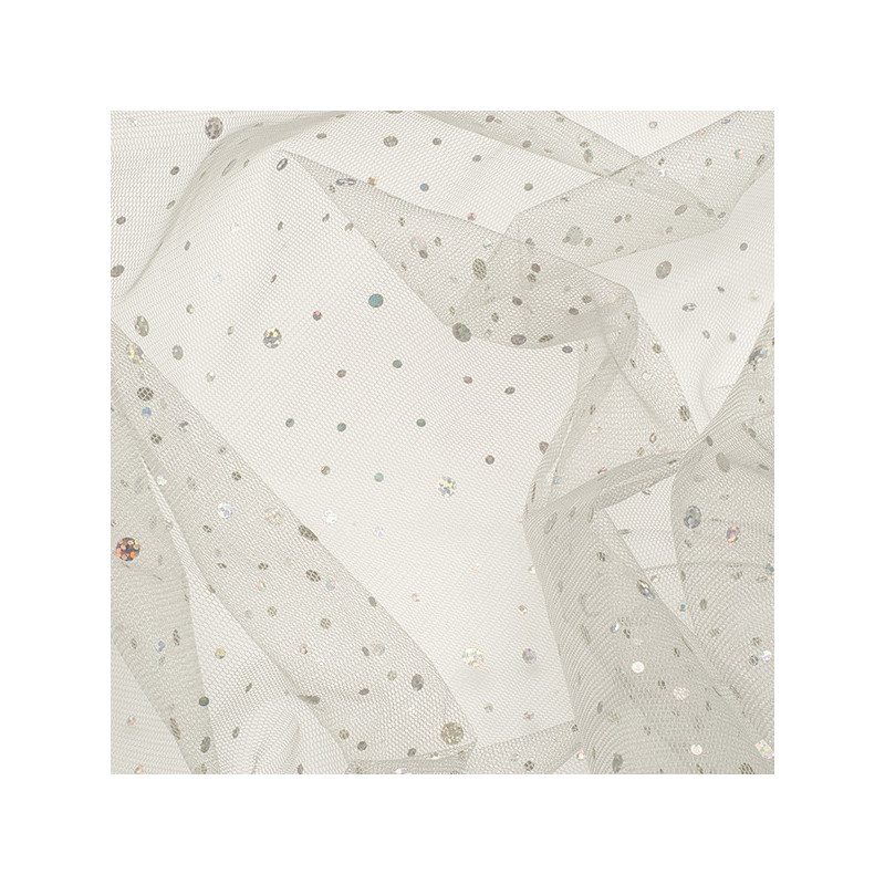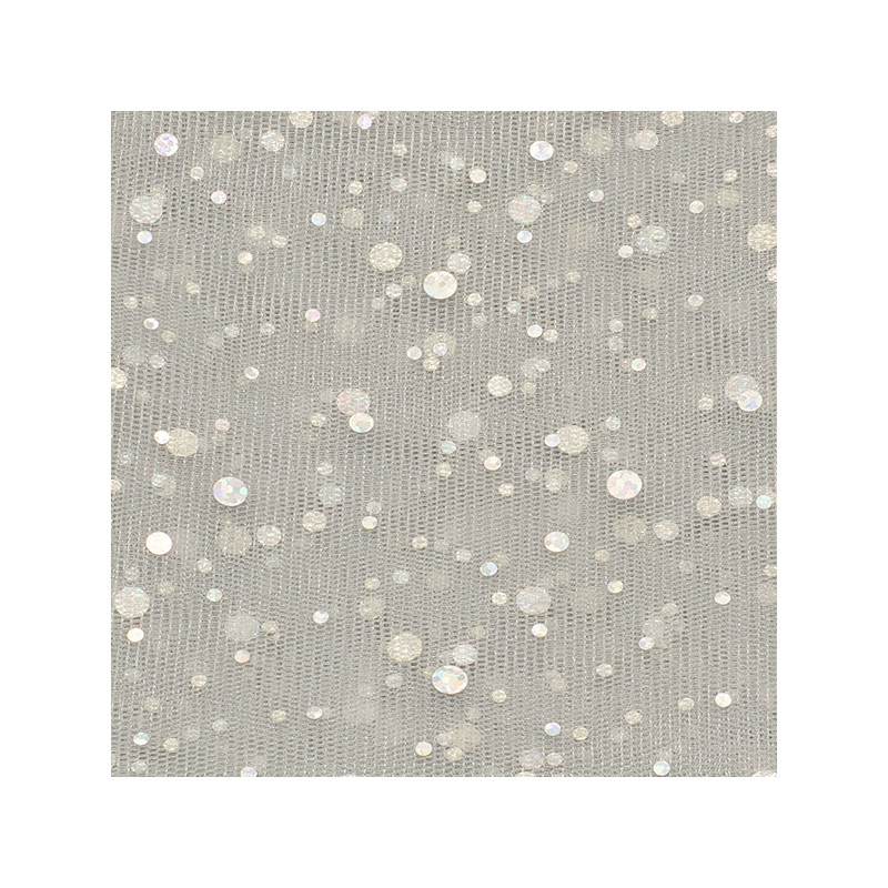 Tissu maille en tulle coloris gris argent à paillettes en largeur 150 cm. Ce modèle sera idéal pour les loisirs créatifs ou la confection...
