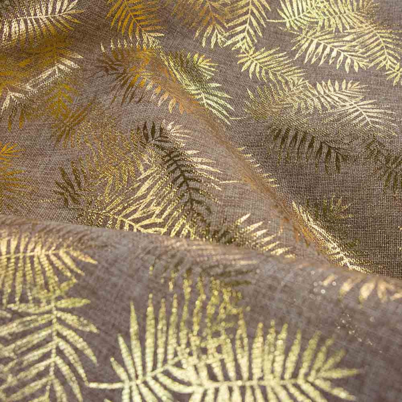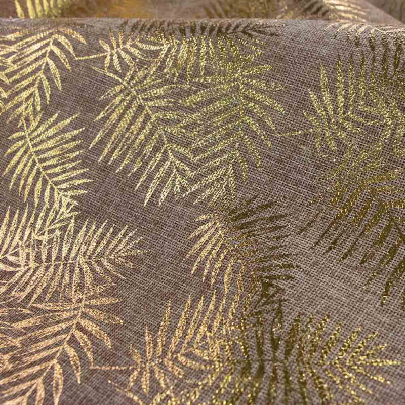Tissu effet jute avec des imprimés feuilles couleur dorée donnera une touche festive à vos créations. Laissez vous séduire par le chic...
