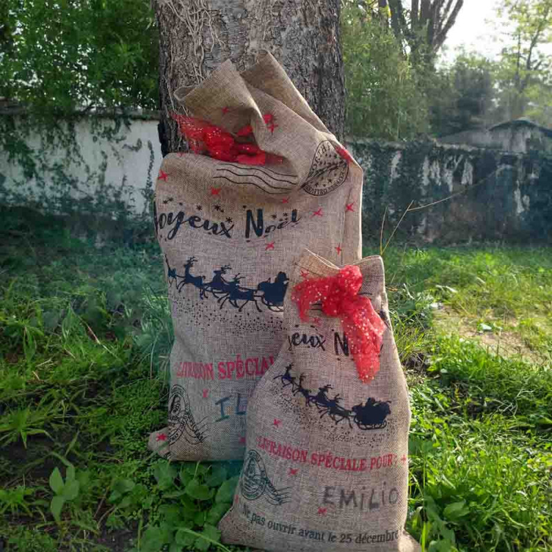 Toile effet jute imprimé sac cadeaux de Noël rouge 150 cm