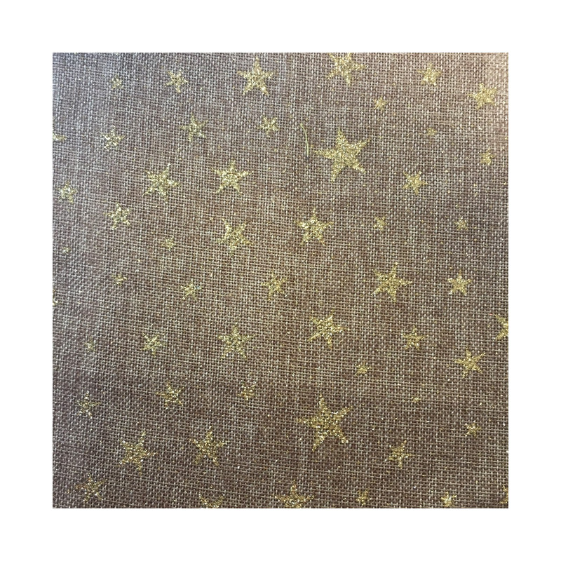 Tissu effet jute avec des imprimés étoiles couleur dorée donnera une touche festive à vos créations. Laissez vous séduire par le chic de ce tissu. Il conviendra parfaitement une large gamme de création.