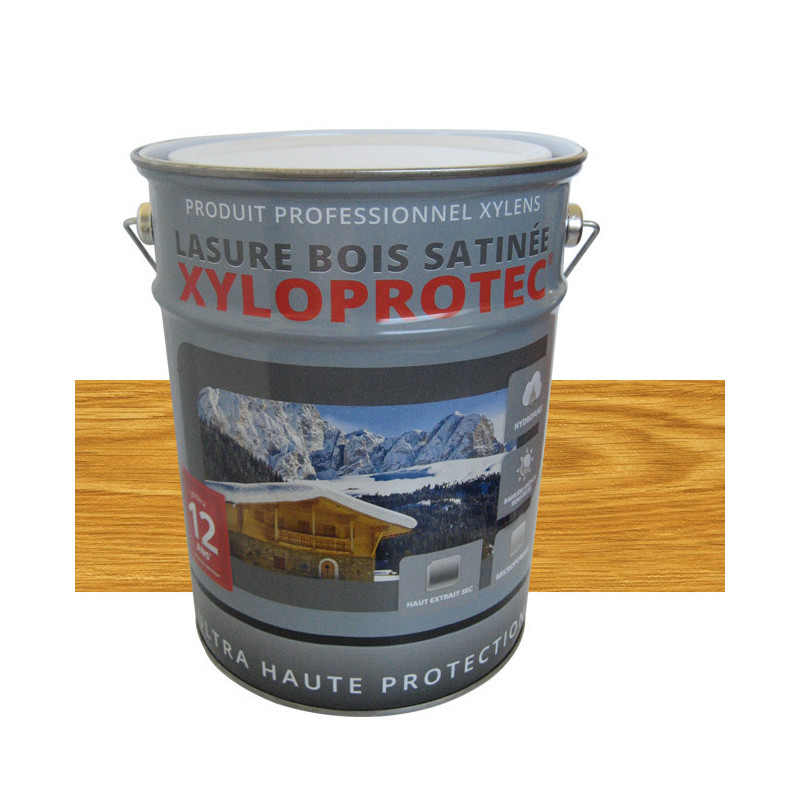 Lasure bois satinée Xyloprotech couleur chêne doré garantie 12 ans est formulée à base de résine alkydes et de solvant. Microporeuse, fongicide du film et hydrofuge à utiliser sur des supports sains. Cette lasure contient un double système agents anti UV qui offre un écran protecteur renforcé et la rend plus résistante les varirations de températures. Son taux de (extrait sec) résine élevé garantie une longévité forte. Nous vous recommandons d'appliquer 3 couches pour renforcer sa tenue dans le temps.