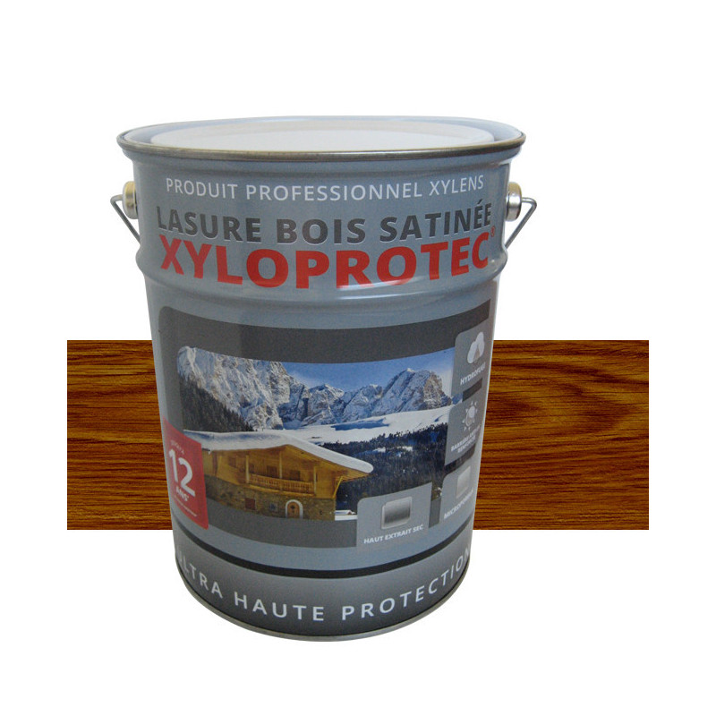 Lasure bois satinée Xyloprotech couleur chêne foncé garantie 12 ans est formulée à base de résine alkydes et de solvant. Microporeuse, fongicide du film et hydrofuge à utiliser sur des supports sains. Cette lasure contient un double système agents anti UV qui offre un écran protecteur renforcé et la rend plus résistante les varirations de températures. Son taux de (extrait sec) résine élevé garantie une longévité forte. Nous vous recommandons d'appliquer 3 couches pour renforcer sa tenue dans le temps.