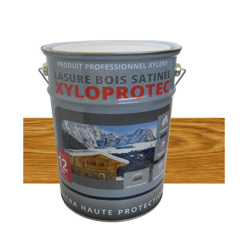 Lasure bois satinée Xyloprotech Ultra Haute Protection couleur chêne naturel garantie 12 ans est formulée à base de résine alkydes et de solvant. Microporeuse, fongicide du film et hydrofuge à utiliser sur des supports sains. Cette lasure contient un double système agents anti UV qui offre un écran protecteur renforcé et la rend plus résistante les varirations de températures. Son taux de (extrait sec) résine élevé garantie une longévité forte. Nous vous recommandons d'appliquer 3 couches pour renforcer sa tenue dans le temps.
