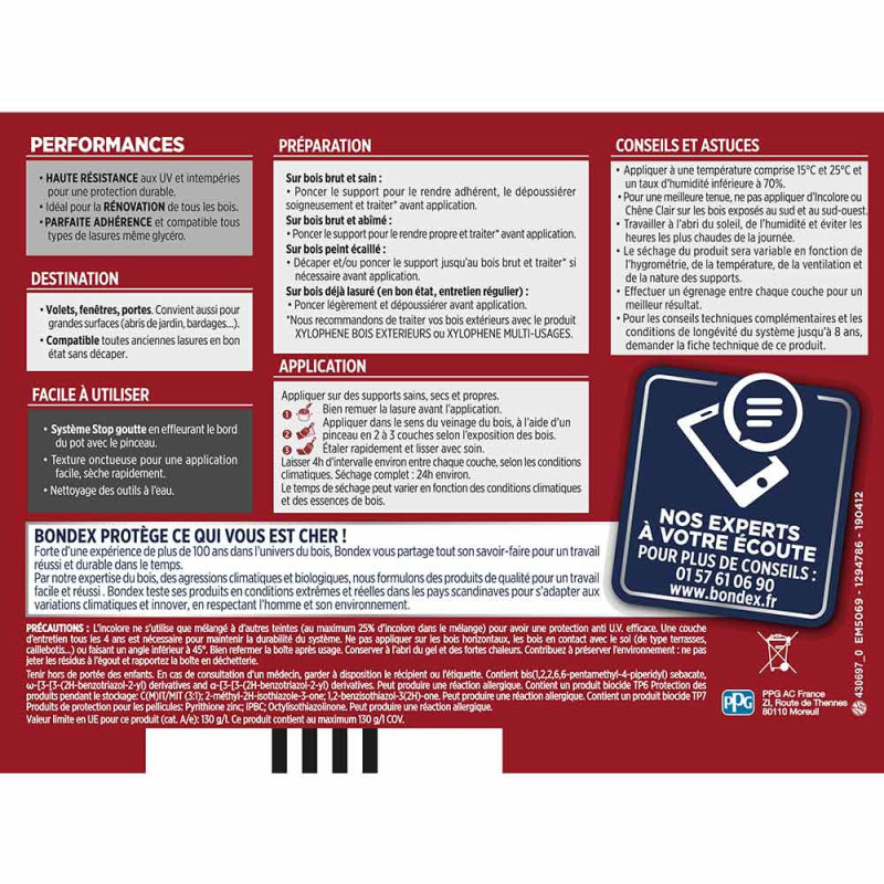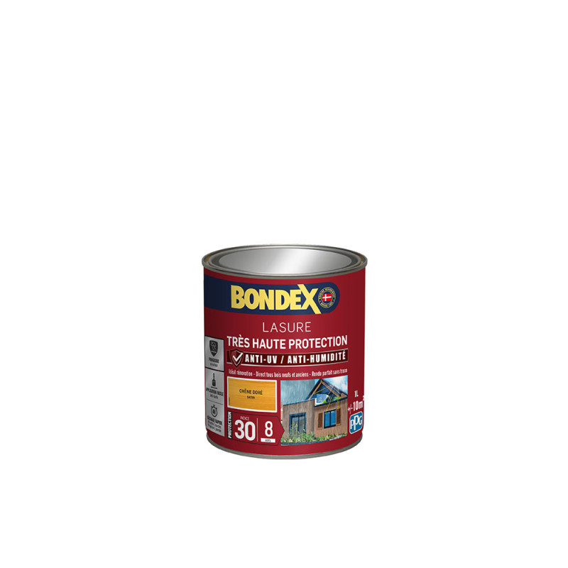 La lasure Bondex 2 en 1 très haute protection est garantie 8 ans contre les UV, les intempéries, les écarts de températures les champignons et les insectes. De couleur chêne doré et à l'aspect satin, elle viendra entretenir vos boiseries. Elle est idéale pour la protection et la décoration de la surface des bois bruts, anciens ou lasurés. Direct tous bois neufs et anciens. Formule onctueuse anti-goutte, transparente, incolore ou teintée. Bonne pénétration produit dans le support grâce à la finesse des particules. Le film sec forme une barrière à la surface du bois empêchant la ponte des insectes. Fongicide encapsulé pour une libération progressive et continue de l’actif fongicide en fonction des contraintes climatiques telles que pluie, brouillard, rosée (protection fongicide en surface du film sec contre le développement des champignons).