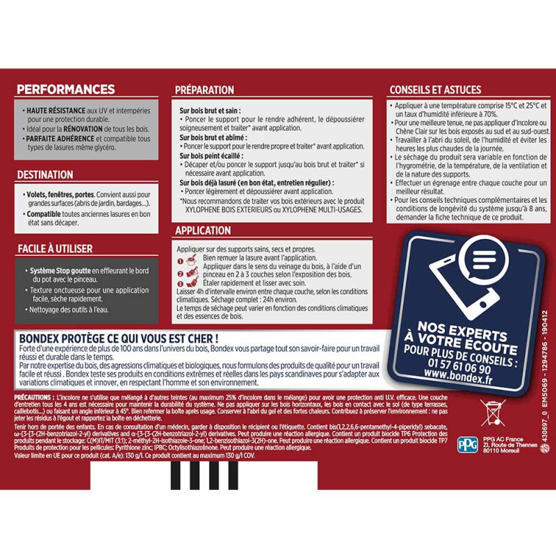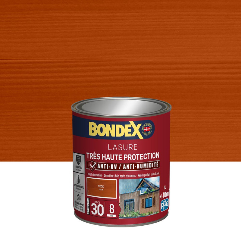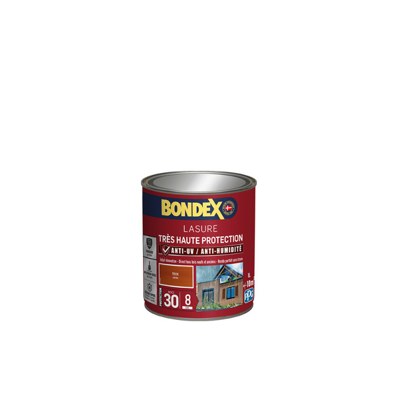 La lasure Bondex 2 en 1 très haute protection est garantie 8 ans contre les UV, les intempéries, les écarts de températures les champignons et les insectes. De couleur teck et à l'aspect satin, elle viendra entretenir vos boiseries. Elle est idéale pour la protection et la décoration de la surface des bois bruts, anciens ou lasurés. Direct tous bois neufs et anciens. Formule onctueuse anti-goutte, transparente, incolore ou teintée. Bonne pénétration produit dans le support grâce à la finesse des particules. Le film sec forme une barrière à la surface du bois empêchant la ponte des insectes. Fongicide encapsulé pour une libération progressive et continue de l’actif fongicide en fonction des contraintes climatiques telles que pluie, brouillard, rosée (protection fongicide en surface du film sec contre le développement des champignons).