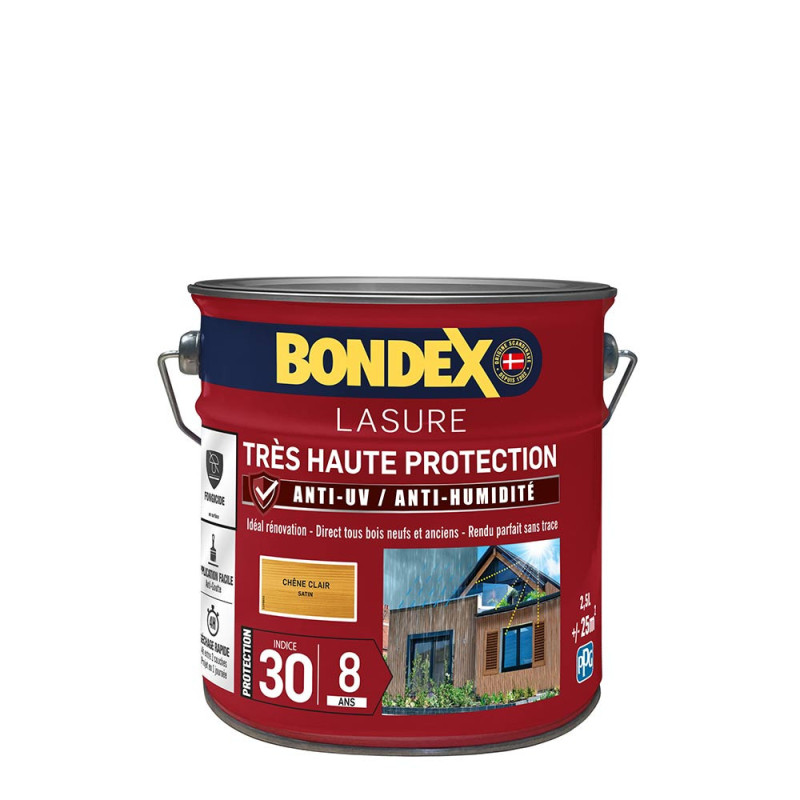 La lasure Bondex 2 en 1 très haute protection est garantie 8 ans contre les UV, les intempéries, les écarts de températures les champignons et les insectes. De couleur chêne clair et à l'aspect satin, elle viendra entretenir vos boiseries. Elle est idéale pour la protection et la décoration de la surface des bois bruts, anciens ou lasurés. Direct tous bois neufs et anciens. Formule onctueuse anti-goutte, transparente, incolore ou teintée. Bonne pénétration produit dans le support grâce à la finesse des particules. Le film sec forme une barrière à la surface du bois empêchant la ponte des insectes. Fongicide encapsulé pour une libération progressive et continue de l’actif fongicide en fonction des contraintes climatiques telles que pluie, brouillard, rosée (protection fongicide en surface du film sec contre le développement des champignons).