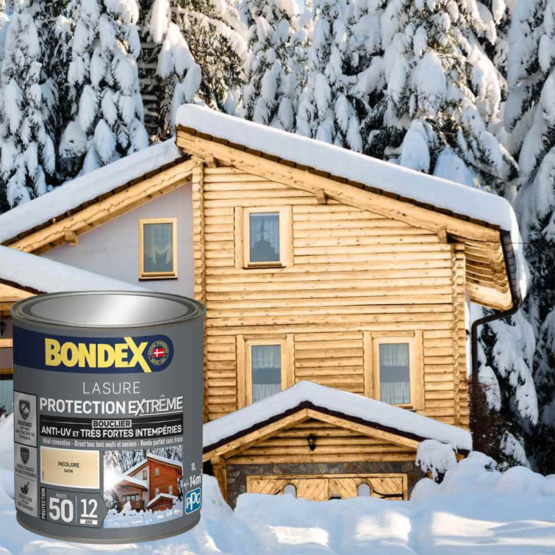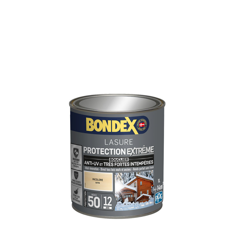 La lasure Bondex 2 en 1 protection extrême est garantie 12 ans contre les UV, les intempéries, les écarts de températures les champignons et les insectes. De couleur incolore et à la finition satin elle viendra entretenir vos boiseries. Elle est idéale pour la protection et la décoration de la surface des bois bruts, anciens ou lasurés. Plusieurs formules existent : transparente, incolore ou teintée (teintes variables en fonction des diverses essences de bois). Sa technologie microporeuse permet de repousser l’eau en laissant respirer le bois. Le film sec forme une barrière à la surface du bois empêchant la ponte desinsectes.La protection extrême lutte contre les dégâts causés par les intempéries : pluie, neige, gel, grêle.Son bouclier anti-UV : protège le bois contre les rayons solaires et évite l’effet dugrisaillement (à l’exception de l’incolore et du chêne clair).