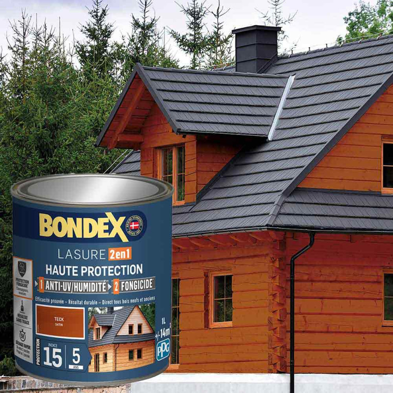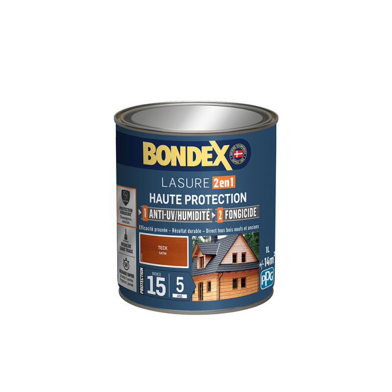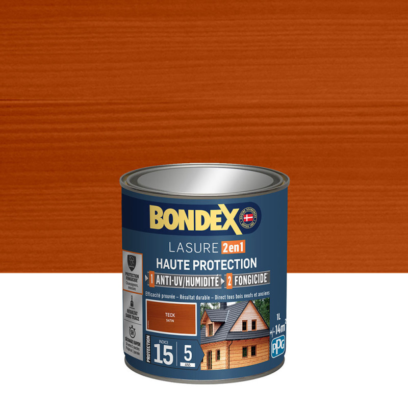 La lasure Bondex 2 en 1 haute protection est garantie 5 ans contre les UV, les intempéries, les écarts de températures les champignons et les insectes. De couleur teck et à l'aspect satin, elle viendra entretenir vos boiseries. Elle est idéale pour la protection et la décoration de la surface des bois bruts, anciens ou lasurés. Direct tous bois neufs et anciens. Formule onctueuse anti-goutte, transparente, incolore ou teintée. Bonne pénétration produit dans le support grâce à la finesse des particules. Le film sec forme une barrière à la surface du bois empêchant la ponte des insectes. Fongicide encapsulé pour une libération progressive et continue de l’actif fongicide en fonction des contraintes climatiques telles que pluie, brouillard, rosée (protection fongicide en surface du film sec contre le développement des champignons).