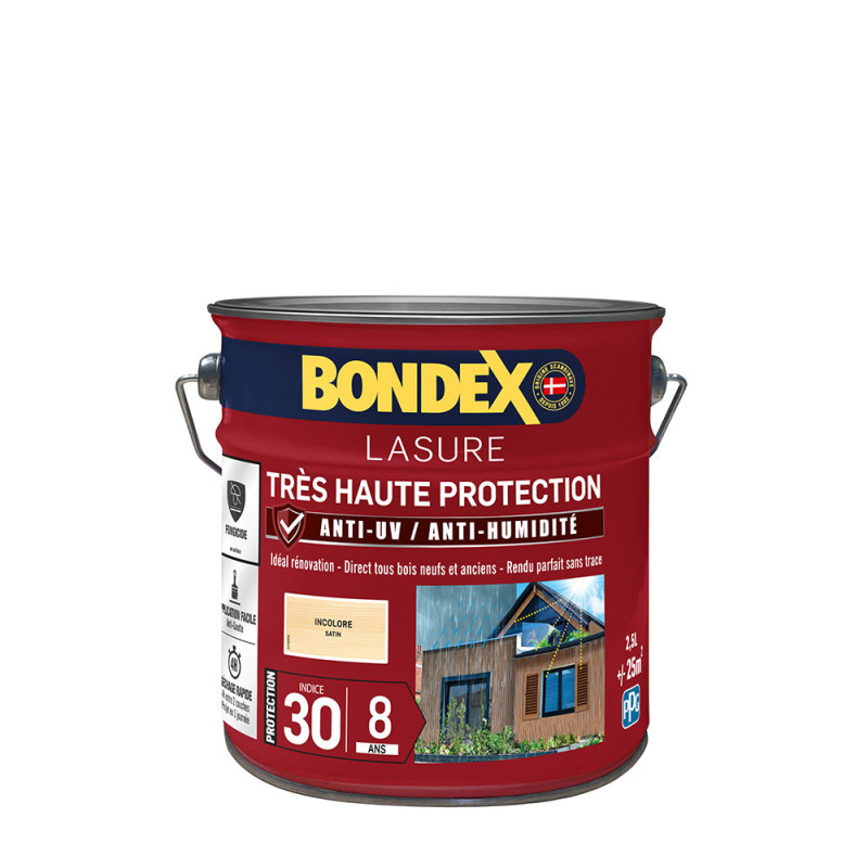 La lasure Bondex 2 en 1 très haute protection est garantie 8 ans contre les UV, les intempéries, les écarts de températures les champignons et les insectes. De couleur incolore et à l'aspect satin, elle viendra entretenir vos boiseries. Elle est idéale pour la protection et la décoration de la surface des bois bruts, anciens ou lasurés. Direct tous bois neufs et anciens. Formule onctueuse anti-goutte, transparente, incolore ou teintée. Bonne pénétration produit dans le support grâce à la finesse des particules. Le film sec forme une barrière à la surface du bois empêchant la ponte des insectes. Fongicide encapsulé pour une libération progressive et continue de l’actif fongicide en fonction des contraintes climatiques telles que pluie, brouillard, rosée (protection fongicide en surface du film sec contre le développement des champignons).