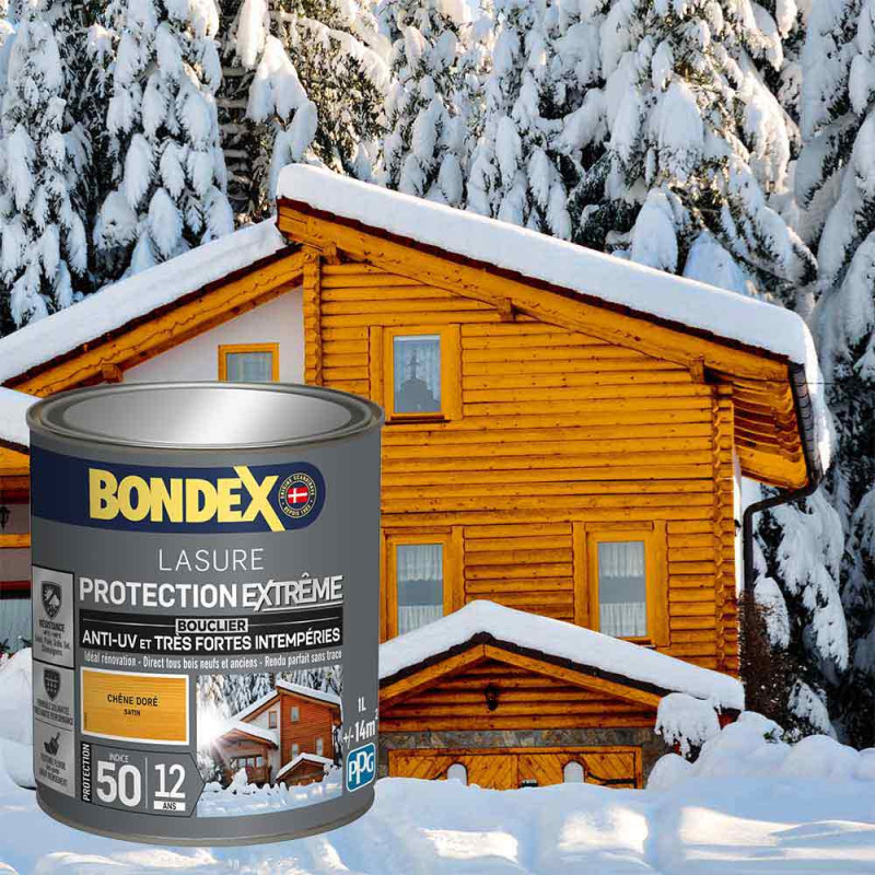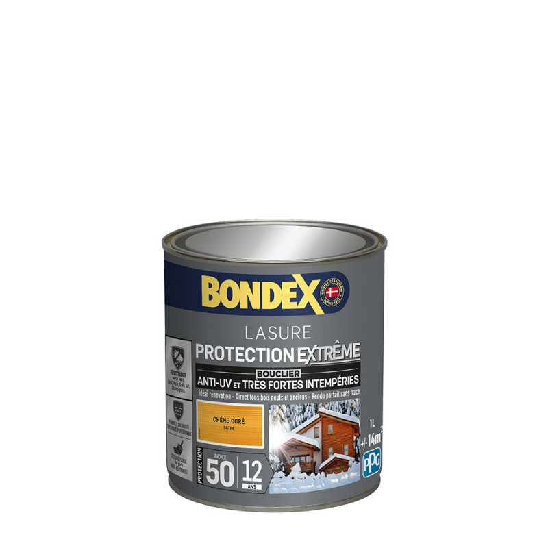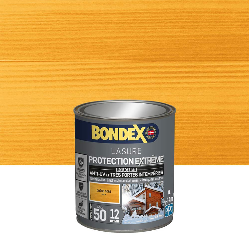 La lasure Bondex 2 en 1 protection extrême est garantie 12 ans contre les UV, les intempéries, les écarts de températures les champignons et les insectes. De couleur chêne doré et à la finition satin elle viendra entretenir vos boiseries. Elle est idéale pour la protection et la décoration de la surface des bois bruts, anciens ou lasurés. Plusieurs formules existent : transparente, incolore ou teintée (teintes variables en fonction des diverses essences de bois). Sa technologie microporeuse permet de repousser l’eau en laissant respirer le bois. Le film sec forme une barrière à la surface du bois empêchant la ponte desinsectes.La protection extrême lutte contre les dégâts causés par les intempéries : pluie, neige, gel, grêle.Son bouclier anti-UV : protège le bois contre les rayons solaires et évite l’effet dugrisaillement (à l’exception de l’incolore et du chêne clair).