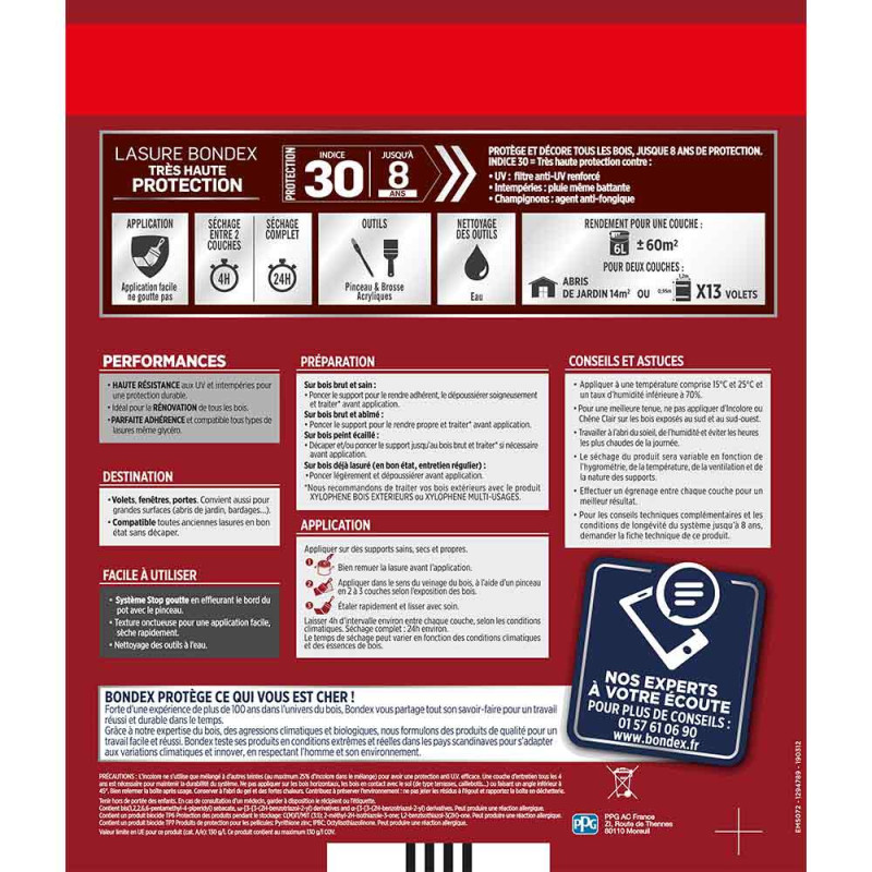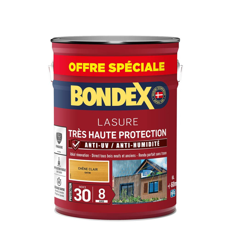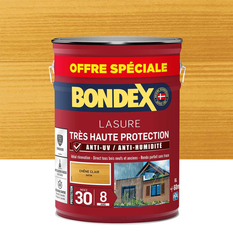 La lasure Bondex 2 en 1 très haute protection est garantie 8 ans contre les UV, les intempéries, les écarts de températures les champignons et les insectes. De couleur chêne clair et à l'aspect satin, elle viendra entretenir vos boiseries. Elle est idéale pour la protection et la décoration de la surface des bois bruts, anciens ou lasurés. Direct tous bois neufs et anciens. Formule onctueuse anti-goutte, transparente, incolore ou teintée. Bonne pénétration produit dans le support grâce à la finesse des particules. Le film sec forme une barrière à la surface du bois empêchant la ponte des insectes. Fongicide encapsulé pour une libération progressive et continue de l’actif fongicide en fonction des contraintes climatiques telles que pluie, brouillard, rosée (protection fongicide en surface du film sec contre le développement des champignons).