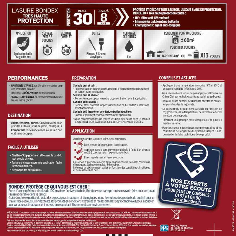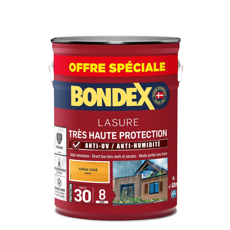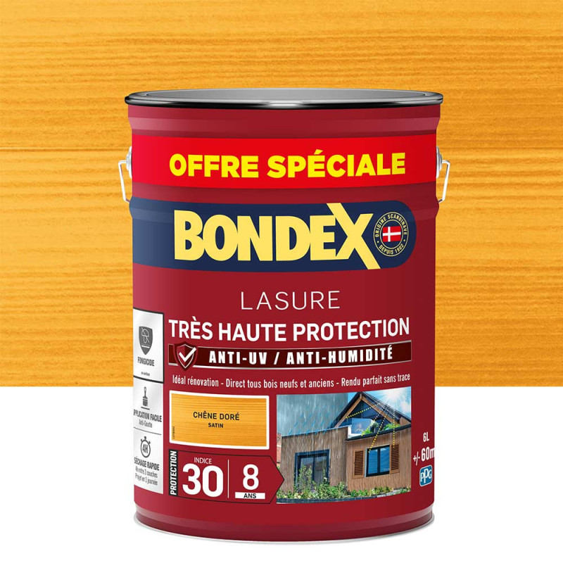 La lasure Bondex 2 en 1 très haute protection est garantie 8 ans contre les UV, les intempéries, les écarts de températures les champignons et les insectes. De couleur chêne doré et à l'aspect satin, elle viendra entretenir vos boiseries. Elle est idéale pour la protection et la décoration de la surface des bois bruts, anciens ou lasurés. Direct tous bois neufs et anciens. Formule onctueuse anti-goutte, transparente, incolore ou teintée. Bonne pénétration produit dans le support grâce à la finesse des particules. Le film sec forme une barrière à la surface du bois empêchant la ponte des insectes. Fongicide encapsulé pour une libération progressive et continue de l’actif fongicide en fonction des contraintes climatiques telles que pluie, brouillard, rosée (protection fongicide en surface du film sec contre le développement des champignons).