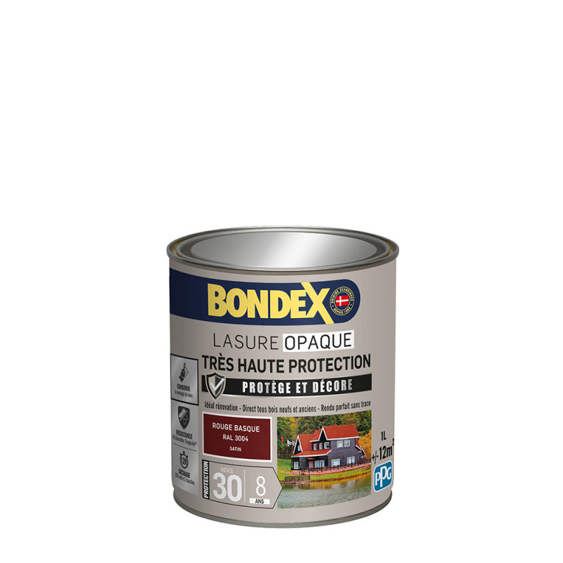 La lasure Bondex 2 en 1opaque très haute protection est garantie 8 ans contre les UV, les intempéries, les écarts de températures les champignons et les insectes. De couleur rouge basque et à la finition satin elle viendra entretenir vos boiseries. Elle est idéale pour la protection et la décoration de la surface des bois bruts, anciens ou lasurés. Direct tous bois neufs et anciens. Formule onctueuse anti-goutte, transparente, incolore ou teintée. Bonne pénétration produit dans le support grâce à la finesse des particules. Le film sec forme une barrière à la surface du bois empêchant la ponte des insectes. Fongicide encapsulé pour une libération progressive et continue de l’actif fongicide en fonction des contraintes climatiques telles que pluie, brouillard, rosée (protection fongicide en surface du film sec contre le développement des champignons).