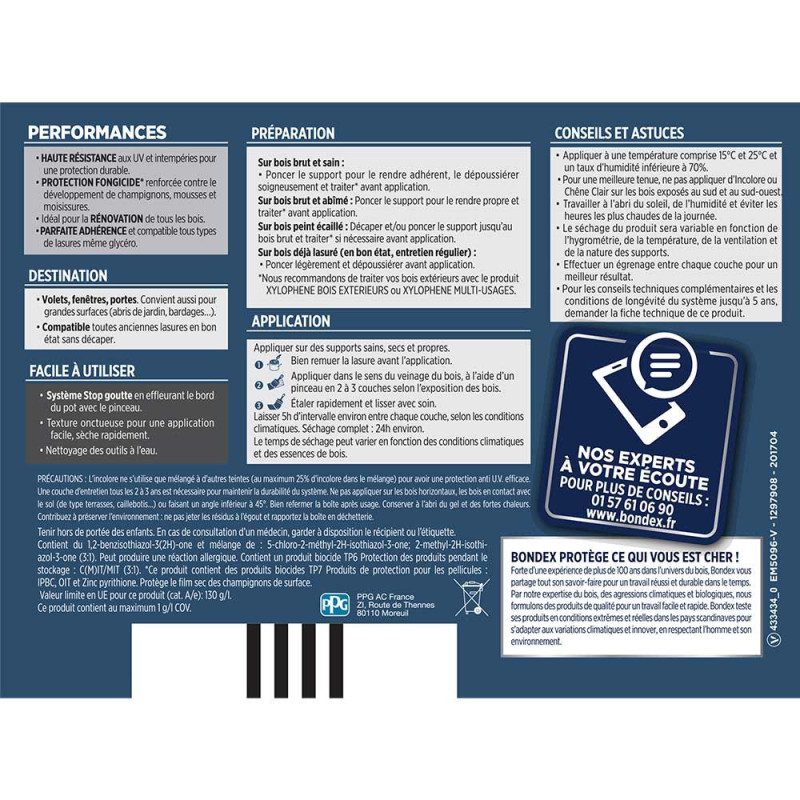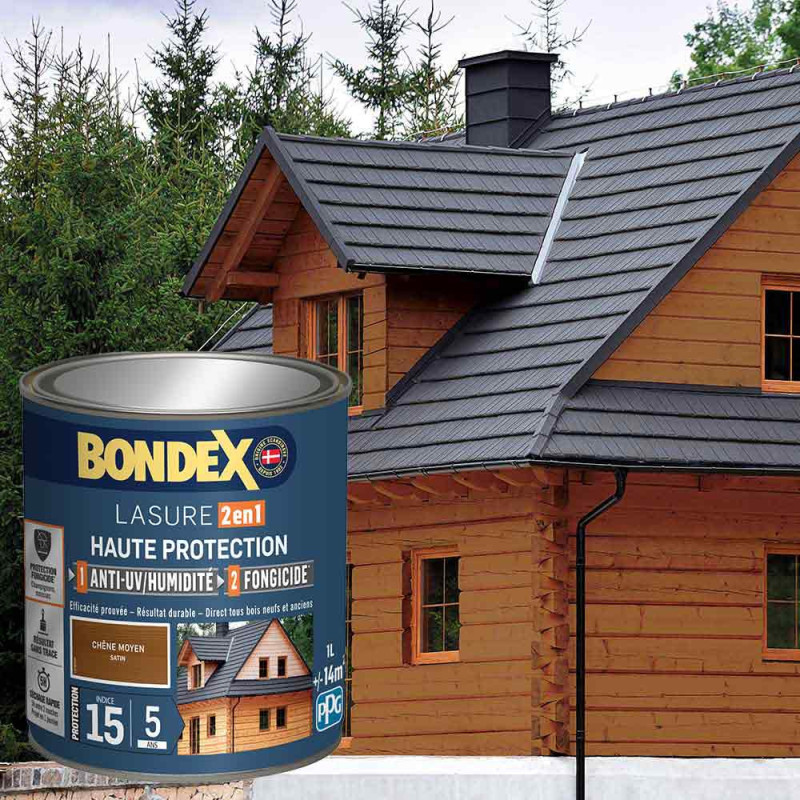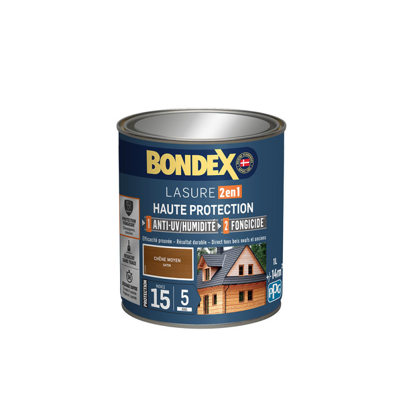La lasure Bondex 2 en 1 haute protection est garantie 5 ans contre les UV, les intempéries, les écarts de températures les champignons et les insectes. De couleur chêne moyen et à l'aspect satin, elle viendra entretenir vos boiseries. Elle est idéale pour la protection et la décoration de la surface des bois bruts, anciens ou lasurés. Direct tous bois neufs et anciens. Formule onctueuse anti-goutte, transparente, incolore ou teintée. Bonne pénétration produit dans le support grâce à la finesse des particules. Le film sec forme une barrière à la surface du bois empêchant la ponte des insectes. Fongicide encapsulé pour une libération progressive et continue de l’actif fongicide en fonction des contraintes climatiques telles que pluie, brouillard, rosée (protection fongicide en surface du film sec contre le développement des champignons).